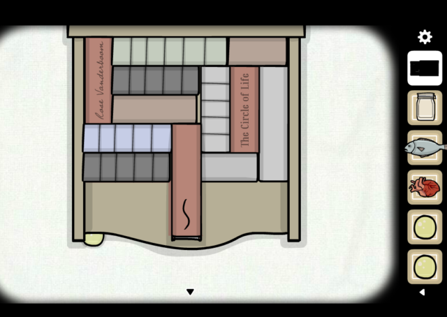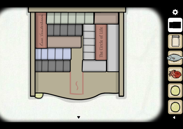 本棚の部屋へ。赤い線に沿って、画像のように本を並べ直す。Sのマークが場所と一致するように。