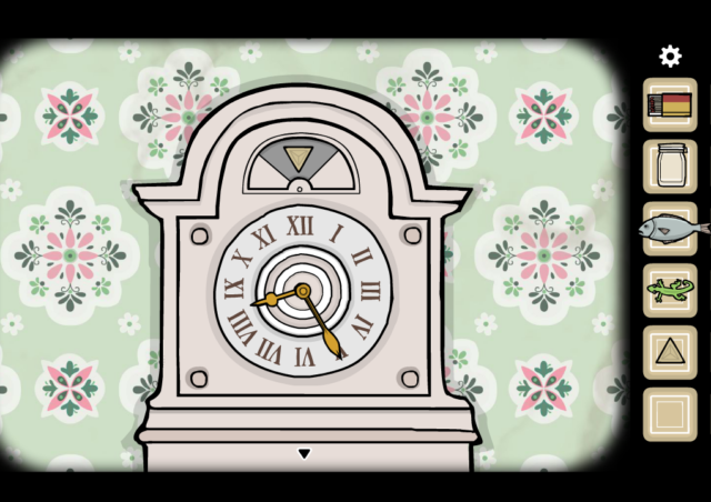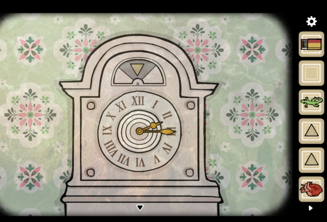 時計のある部屋へ行き、時計の胴体部分にある3つの三角の部分に三角の鍵を3つセットする。