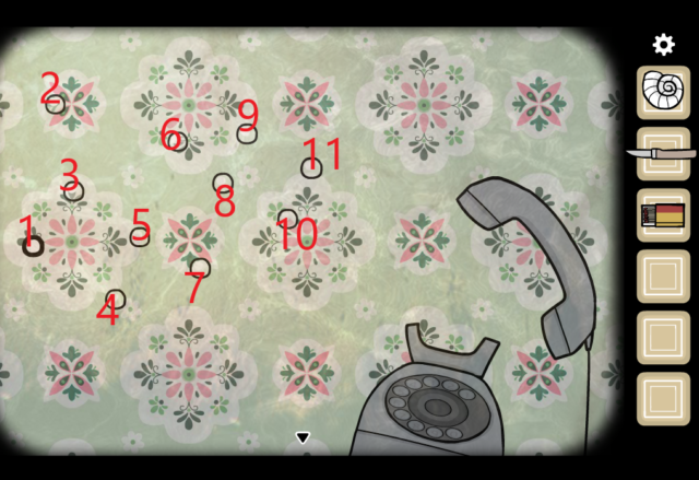 (クリックして「コン」と音がすると最初からやり直しです。音がしない物を選び続ければOK。もしかしたら位置じゃなくて物体での判断かもしれませんが、一応クリアできた時のクリック順を記載しています。法則的には、違うものを選び続ければ良いんだと思います、多分)