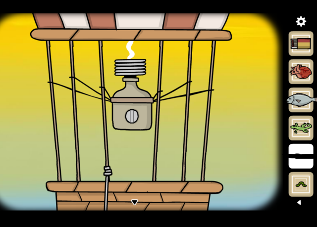 気球をクリック。中央の動力部分にあるつまみをクリック、煙部分にマッチで火をつける