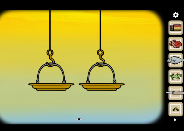 分銅と比較して、魚、芋虫、心臓、ヤモリの重さを調べる