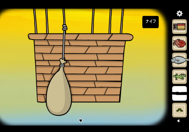 気球が上昇するので、ぶら下がっているロープをナイフで切って荷物を落とす