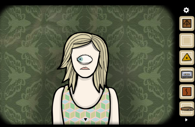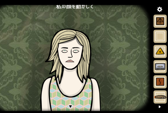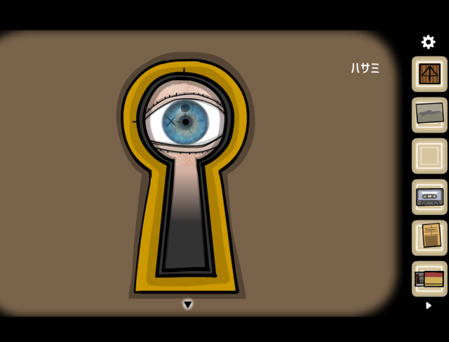 扉の鍵穴をクリックすると、女性がいる。更にクリックすると目が拡大され、9時の方角に×、0時の方角に●が浮かんでいる