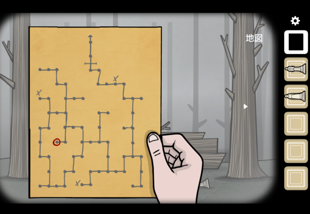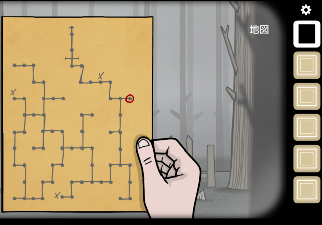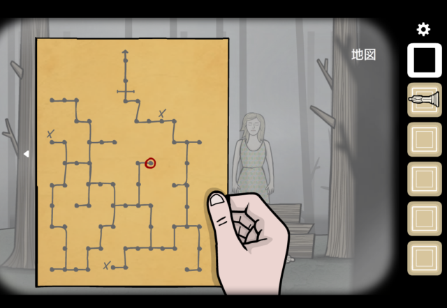 持ち物から地図を確認。今いる場所に赤い○で印がつくので、それを目安に進んで行く。
