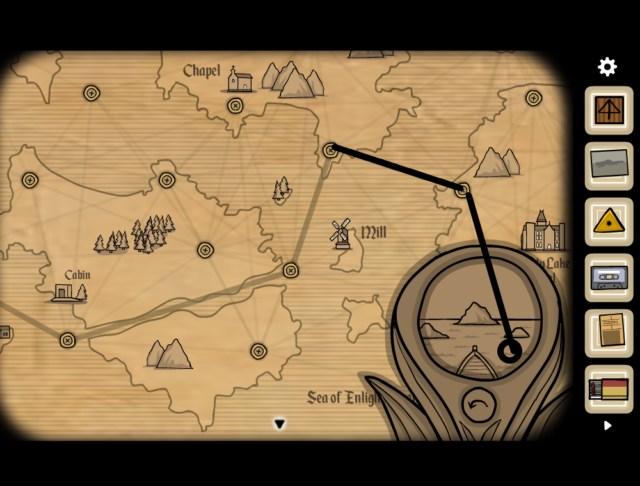 小窓を1回クリックすると風景が1つ進むので、進行方向を向いている時に矛盾がない場所を選んでいく(消したい時は引いた線をクリック)。