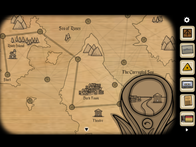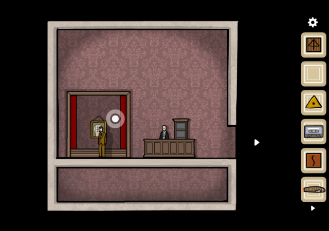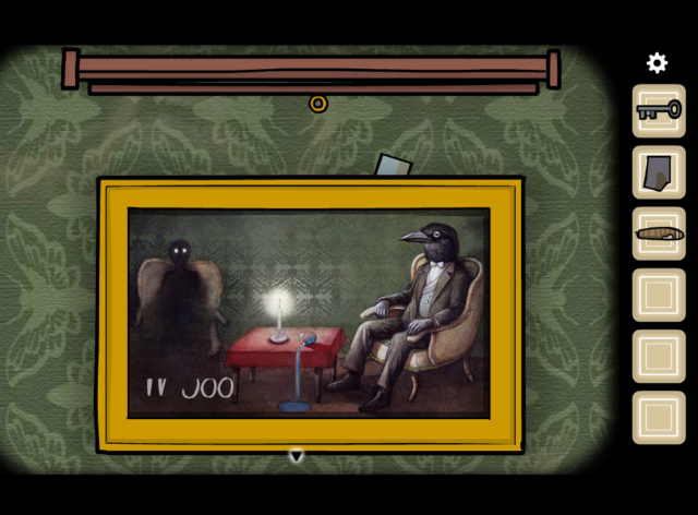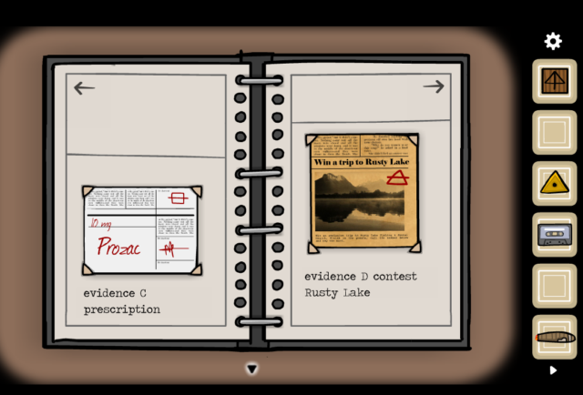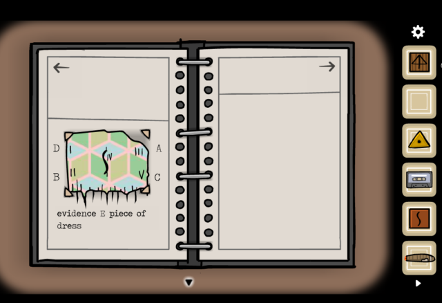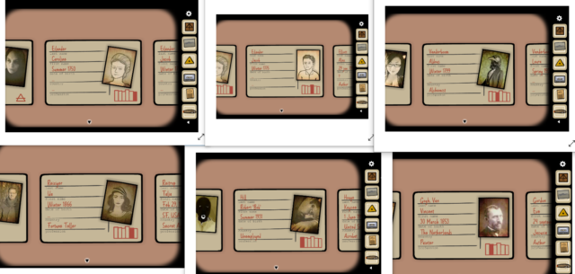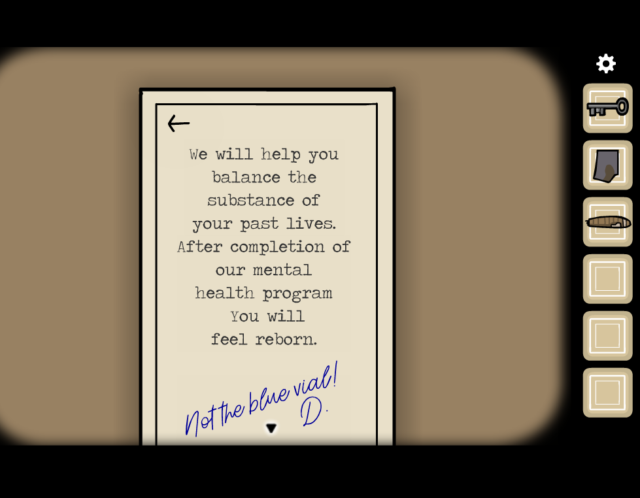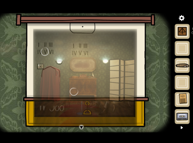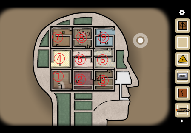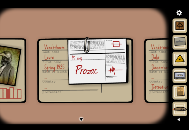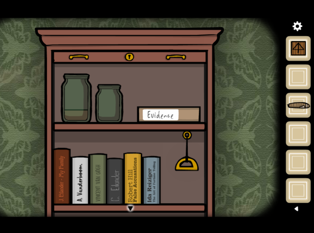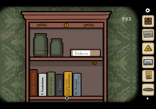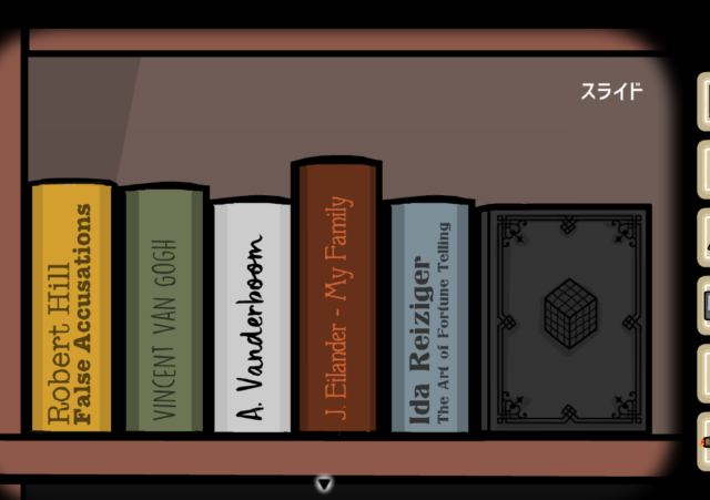 カルテは左右にドラッグで一覧できる。カルテのうち、本棚の本の位置を示す絵が描かれた名前は、映写機のある棚の本名とリンクしている(謎解きは後述)。