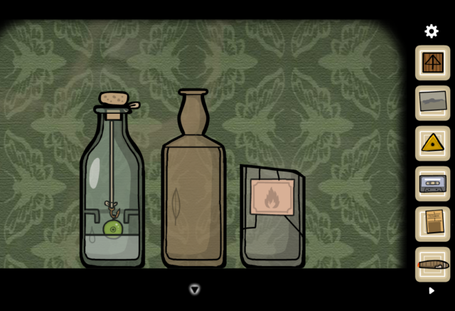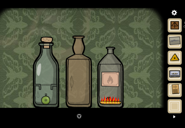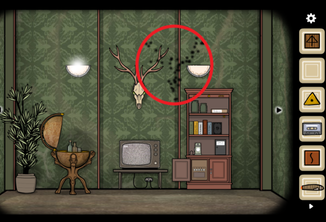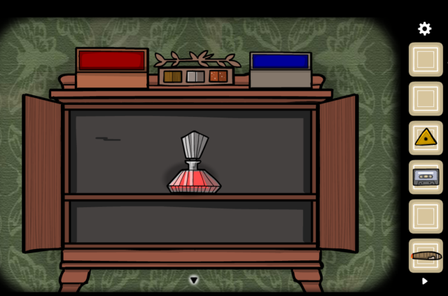 右側の棚、左下の扉をクリック。煙マークを順に合わせる。