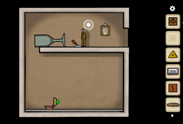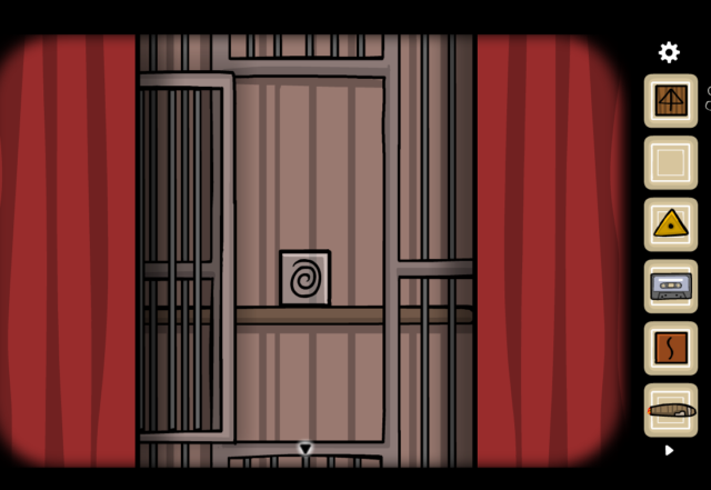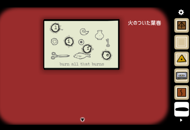 「燃えるものを燃やす」と書いてあるので、火のついた葉巻を使ってダイナマイト、ろうそく、マッチ、葉巻の絵を燃やす(小さな・の部分をクリックすると文字がちょうど見えるように燃える)