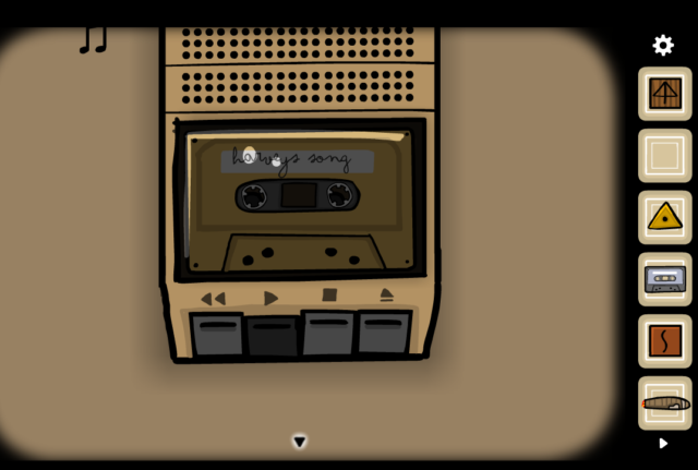 時計のそばにあるテープレコーダーにカセットテープをセット、再生する(右端のイジェクトボタンを押してテープをセット→カバーを閉じて再生ボタン)。