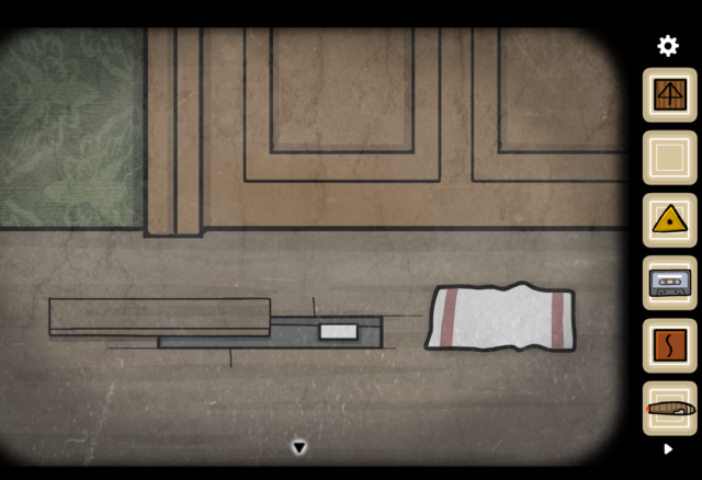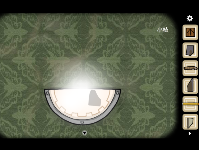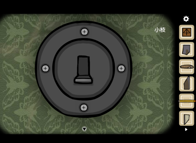 扉の前の血痕をハンカチでふき取り、ひび割れをクリックして板を外す