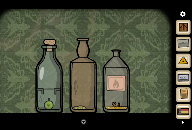 中央の容器に小枝を入れる。虫をクリックして成長させると、最後に蝶となって容器から出て行く。