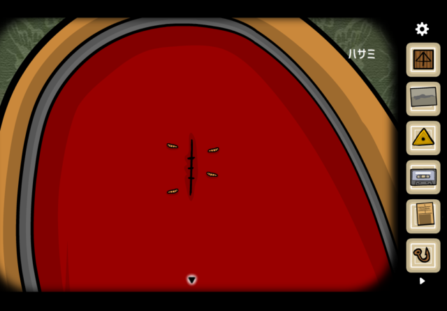 ソファをクリックし、さらに左上の傷を拡大してハサミで切る。釣り糸を入手する