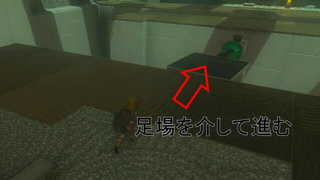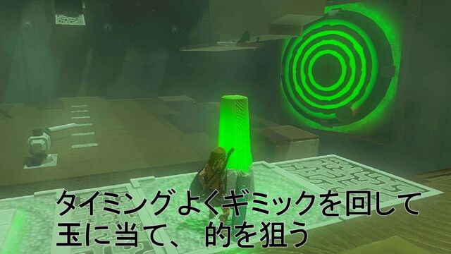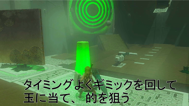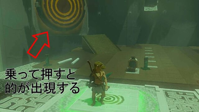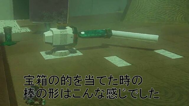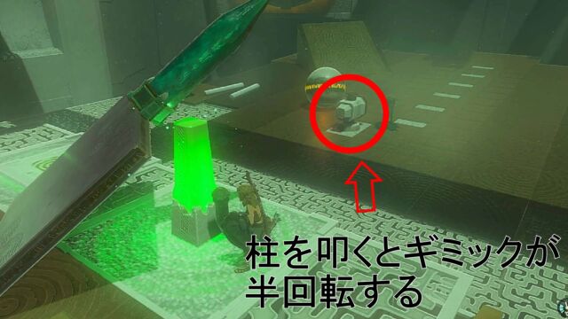 2. 四角いボタンに乗ると、的が出てくる。その横にある柱を叩くと、前方にあるギミックが半回転する。再び叩くと逆に半回転して元に戻る。