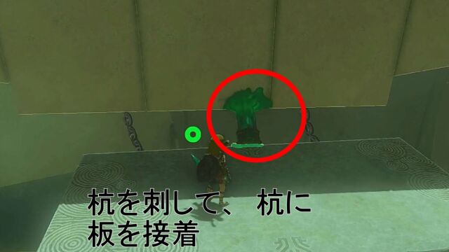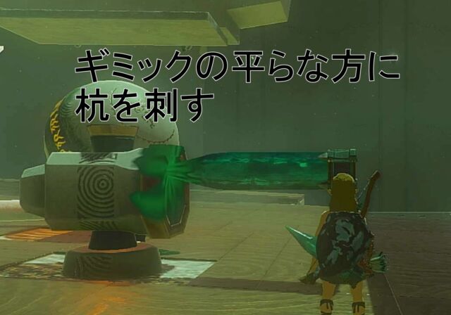 3. 半回転するギミックにウルトラハンドで杭を刺す(杭の尖っている方をギミックの平らな部分に触れさせると、その部分が溶けたようになる。この状態でBボタンを押すと刺さる。刺す深度は要調整)。