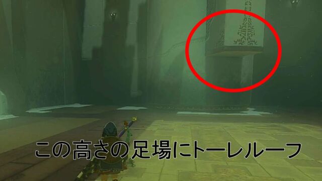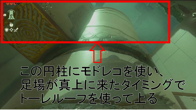 2. 今乗っている足場に隣接する部分ではなく、一段上を回転する円柱にモドレコを使う。真上に足場がきたタイミングでトーレルーフを使って登る。最上階に来たら、祝福があるエリアに飛び移る。