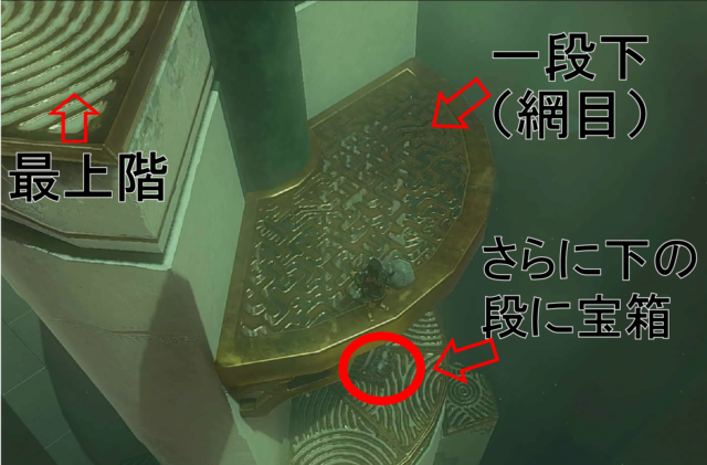 3. 宝箱をとる場合:円柱最上階の足場がない部分の下(金網の足場)に降りる。さらにその真下に降りると宝箱がある。