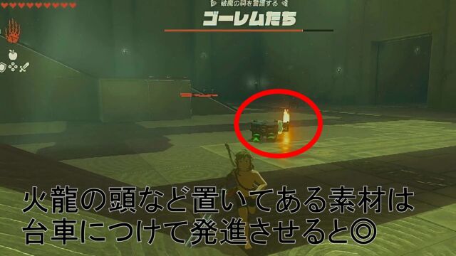 - 攻略のポイント3:ある程度台車に敵を引き付けたら、見つからないよう外周から上に向かう。台車がいくつかあるので全て作動させて攻撃に使う。火龍の頭などの追加素材があるので、台車に接着するのが効果的。