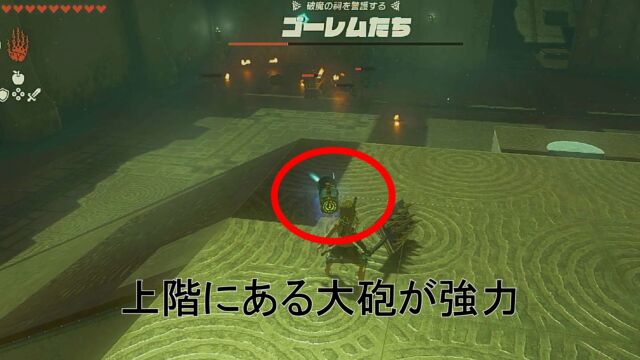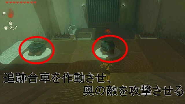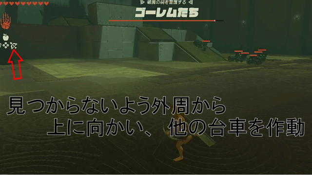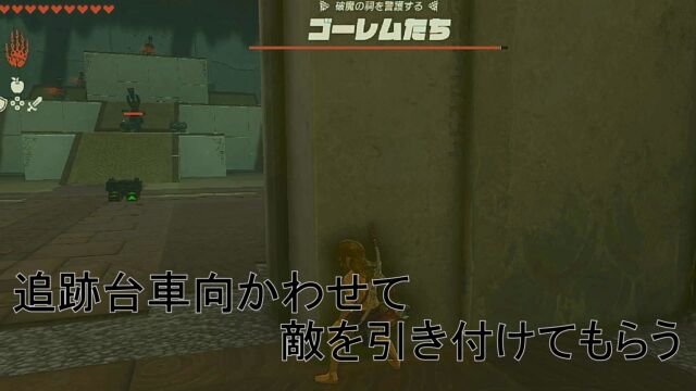- 攻略のポイント2:1体倒したあと、広場に複数の敵がいるので先の追跡台車2台を向かわせる。この時リンクは敵に気づかれないように注意。