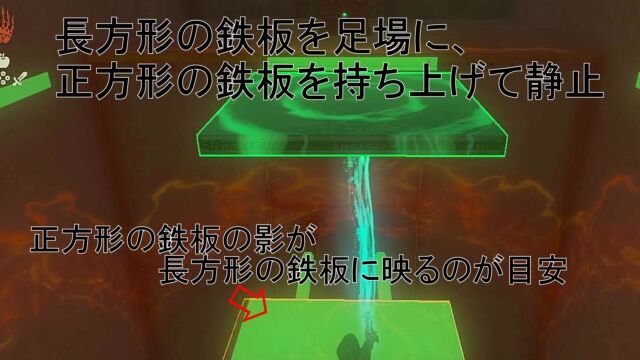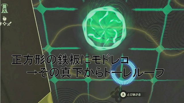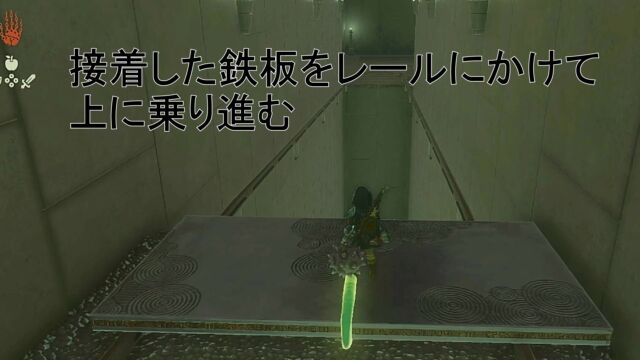 3. 宝箱をとる場合:短いレールの先に宝箱がある。長方形の鉄板を手前に置いて足場にする。正方形の鉄板をウルトラハンドで持ち上げ、長方形鉄板に乗る。長方形の鉄板に少し被るように正方形の鉄板を持ち上げ、少し待つ。ウルトラハンド解除後、すぐ正方形の鉄板にモドレコ→真下からトーレルーフで上がり、宝箱をとる。