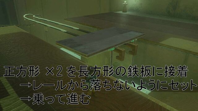 5. 長方形の鉄板に、正方形の鉄板×2を接着し、レールから落ちないようにする。先と同様レールにセットして乗り、進む。