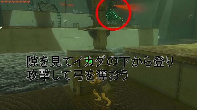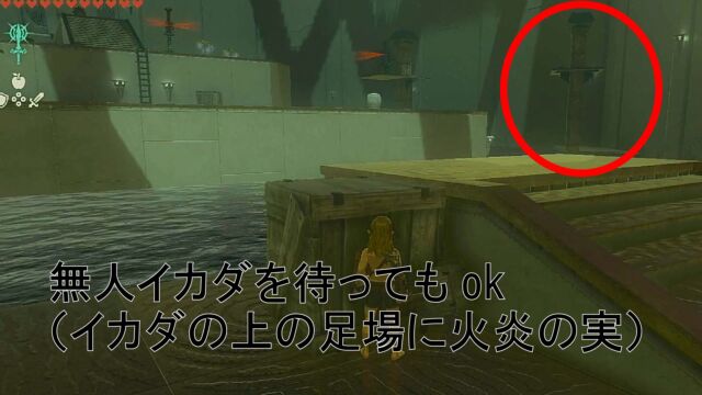 - 攻略のポイント1:時計回りに水が流れているので、流れに沿って泳ぐか、無人のイカダが流れてくるので乗って移動(このイカダの上に火炎の実)。外周に点在するハシゴを登れば中央の足場に行ける。