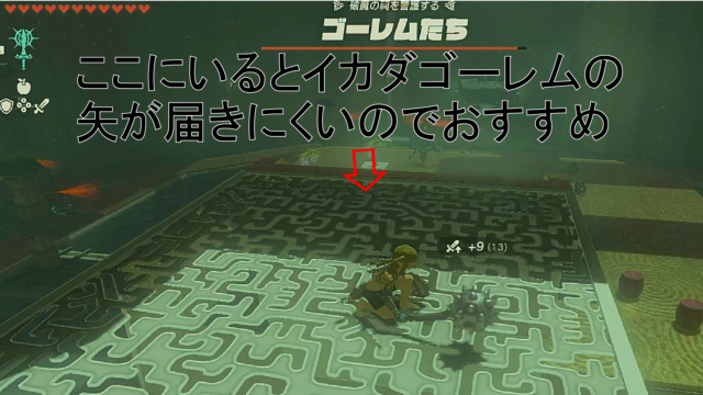 - 攻略のポイント3:画像の場所にいればイカダゴーレムの矢が届きにくいので、中央の敵と戦う時におすすめ。