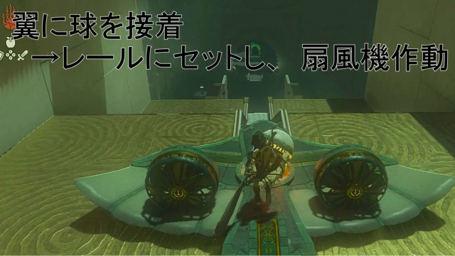 17. レールの上に翼をセットし、翼に球を接着。自身も翼に乗り、扇風機を作動させて戻る。戻ったら球を穴にセットする。