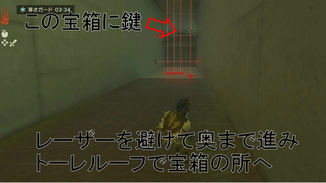 11. レーザーに当たらないよう奥に進み、トーレルーフで宝箱の足場へ。この宝箱に鍵が入っている。