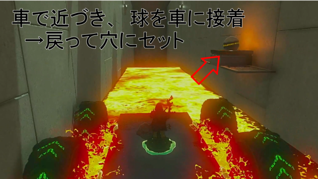 3. 宝箱をとる場合:1から進んできた右側の小道の先に球がある。進んで車に球を接着し、戻る(バックさせるには、スティックを進行方向と逆に倒す)。穴にセットすれば、宝箱への扉が開く。