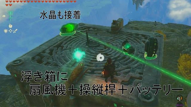 あとは浮かぶ箱に扇風機や操縦桿、バッテリーを取り付けて、祠まで水晶を運びましょう。