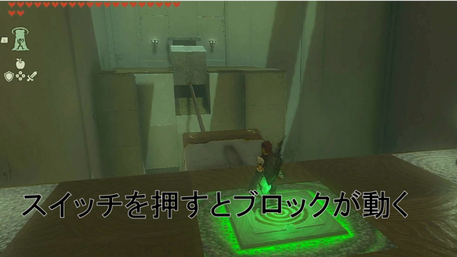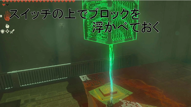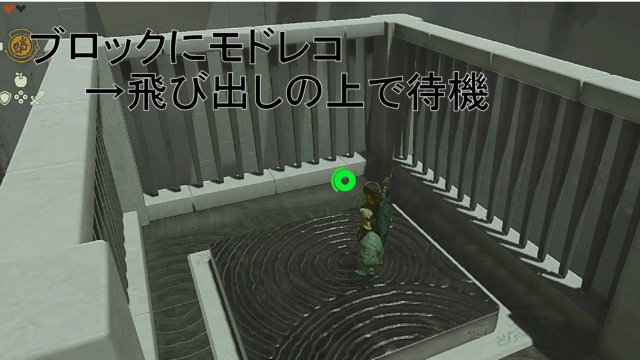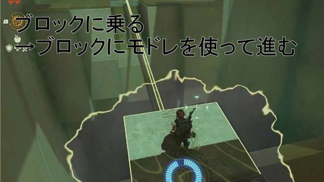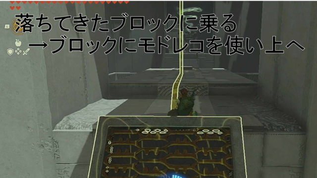 1. スイッチを押す→ブロックに乗り、ブロックにモドレコを使って対岸へ渡る。