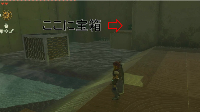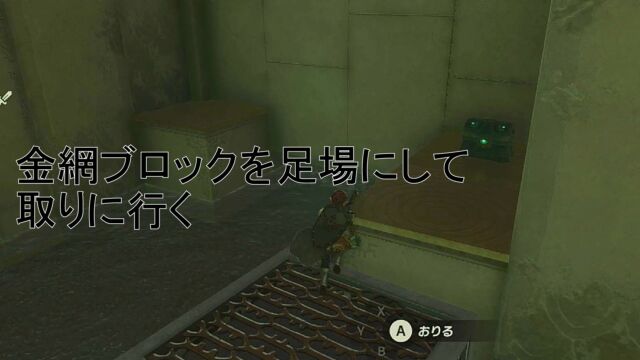 3. 宝箱をとる場合:右側手前の足場に宝箱がある。金網ブロックを近くに設置し、登って取る。