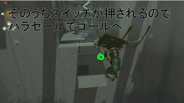 9. 金網ブロックにモドレコを使い、前方にある飛び出しの上に乗って待つ。スイッチが押されて飛び上がったら、パラセールでゴールへ。