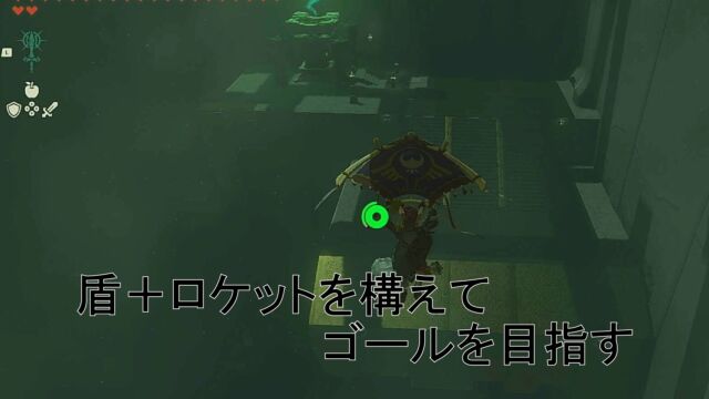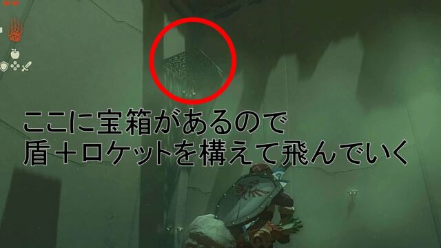 7. 宝箱をとる場合:隅の高所に宝箱がある。盾にロケットをスクラビルド→盾を構えて飛び上がって取りに行く。