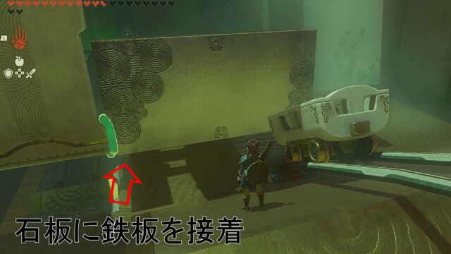 10. トロッコに乗ってから石板を持ち上げ、トロッコに当てた衝撃でゴールに向かう。