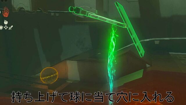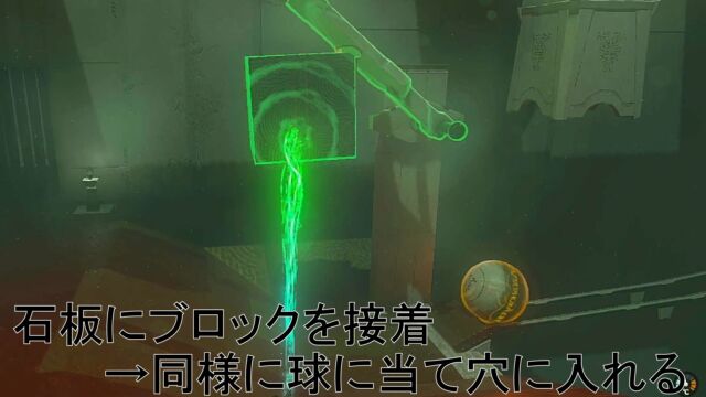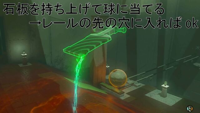 1. 石板をウルトラハンドで持ち上げる→ウルトラハンド解除で石板を球に当てる。球がレールに沿って穴までいけばok。