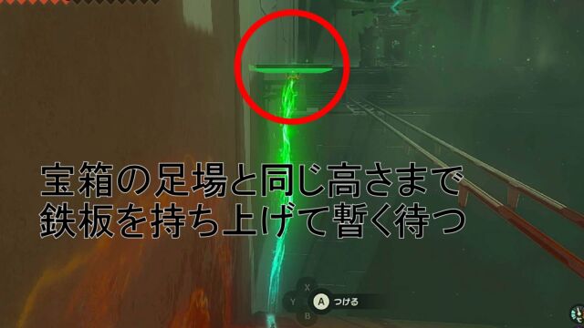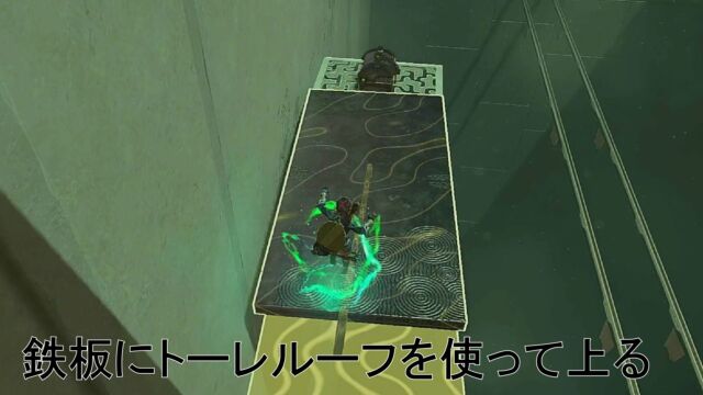 7. 宝箱をとる場合:高い足場の上に宝箱がある。鉄板を宝箱の足場と同じ高さまで持ち上げ、しばらく待つ→鉄板にモドレコ→鉄板にトーレルーフを使って取る。
