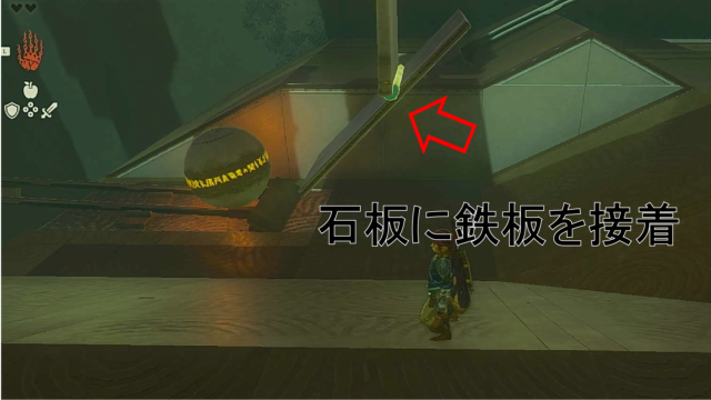 5. 鉄板を画像のように石板に接着する。同様に持ち上げて球に当て、穴に入れればok。