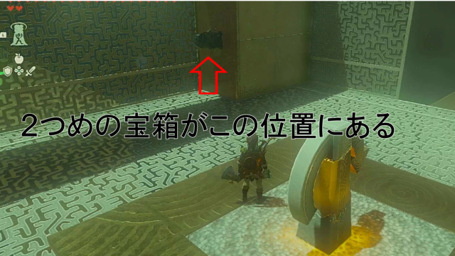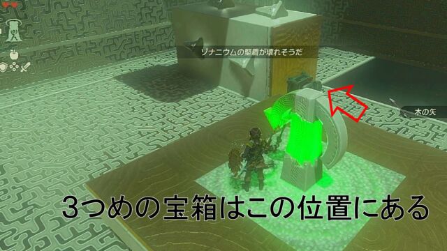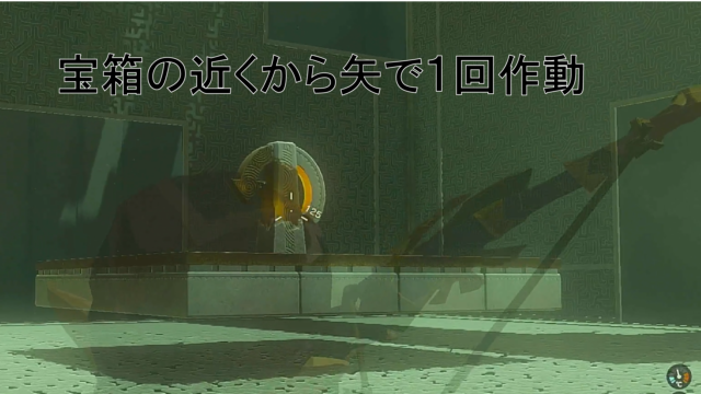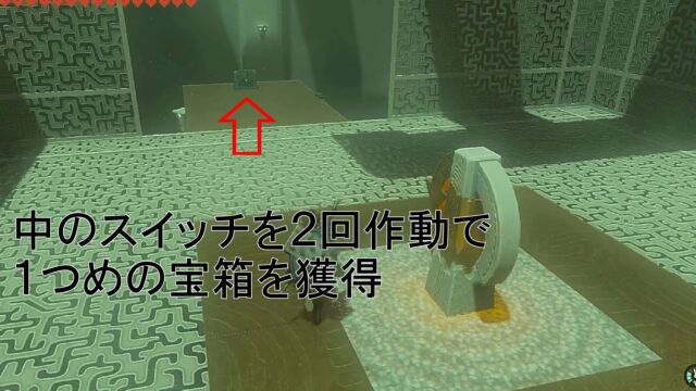 - 宝箱をとる場合2:3の状態だと、2つめの宝箱は画像のようになっている。この状態から、宝箱のすぐ近くで中のスイッチを1回作動する(矢を射る)。