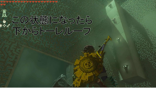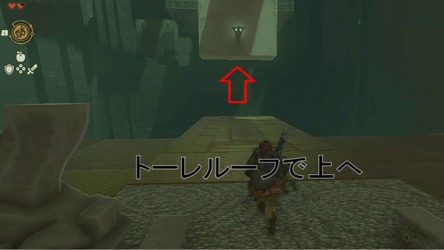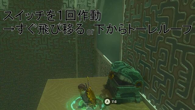 - 宝箱をとる場合3:4の状態だと、3つめの宝箱は画像のようになっている。中のスイッチを1回作動してすぐ宝箱の足場に乗るか、宝箱の足場の真下からトーレルーフを使う。