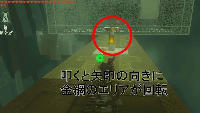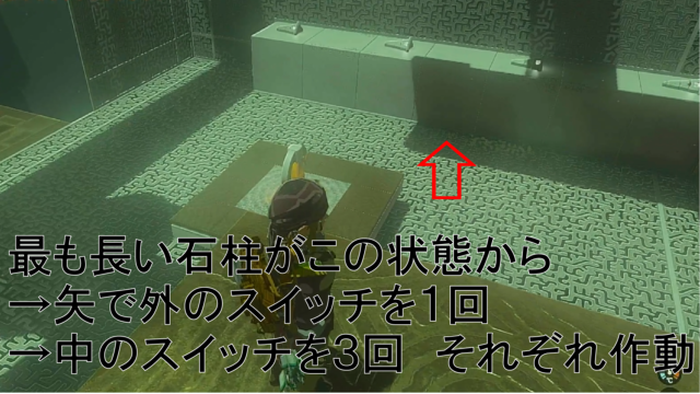 - もっとも細長い石柱が縦長に配置されるようエリアを回転しておく。5の状態からの場合→中から外のスイッチを矢で作動(1回)→中のスイッチを3回作動する。