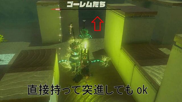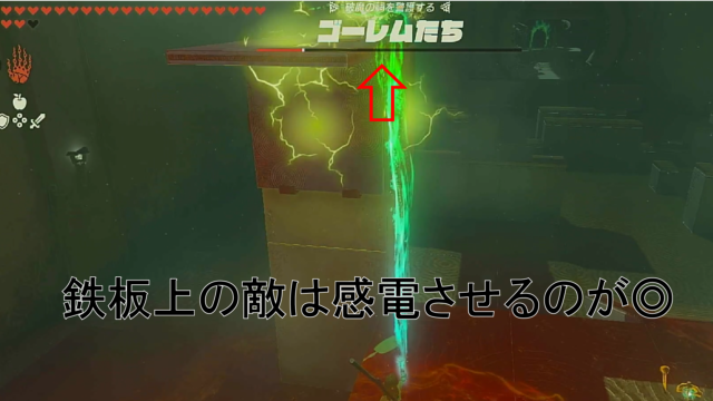 鉄板の上や付近にいるゴーレムは、感電させて倒すと楽です。