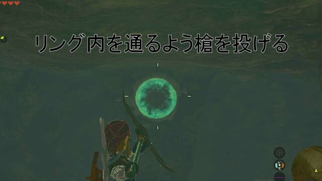 6. 台座(乗ると緑色に光る)に立ち、緑に光るリングを通るようにスクラビルドした槍を投げる。リング内を通ればクリア。