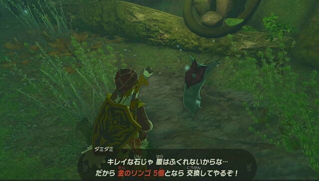 2. ダミダミが持っている水晶を金のりんご5個と交換してもらう。ダミダミが金のりんごの場所を教えてくれるほか、すでに持っていればその場で交換可能(金のりんごは、赤いりんごに混ざってたまに実っている)。