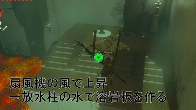 9. 扇風機の上でパラセール→上段に放水柱があるので、溶岩板を作る。