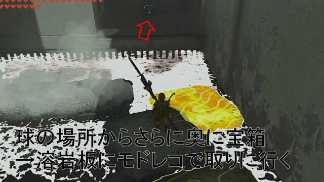 7. 宝箱をとる場合:球のさらに奥に宝箱があるので、溶岩板にモドレコを使って向かう。