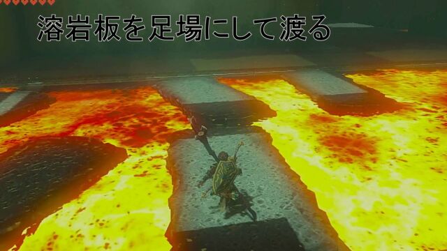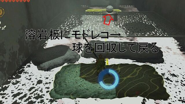 5. 球は溶岩板が流れてくる先にある。溶岩板にモドレコを使用して乗り、球の所まで向かう。球を穴まで運んでセットする。