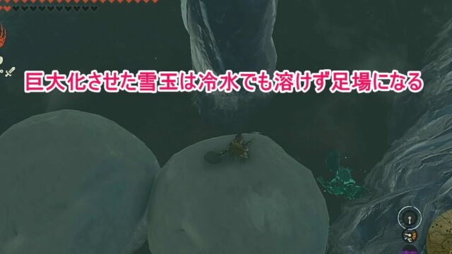 あらかじめ雪の地面で雪玉を動かして巨大化し、いくつか冷水に入れて足場にすると良いでしょう。