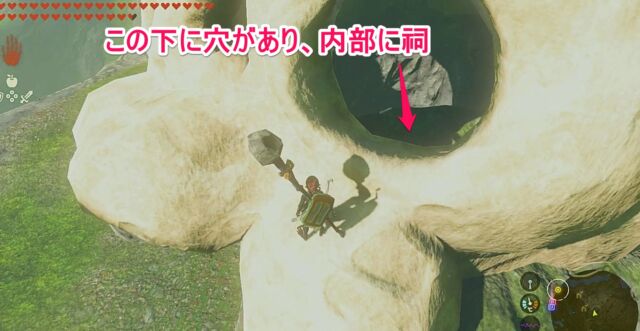 2. 洞窟の入り口は、ドクロが目印。ドクロの中に洞窟へと続く穴が空いており、降りるとすぐに祠に到達できる。